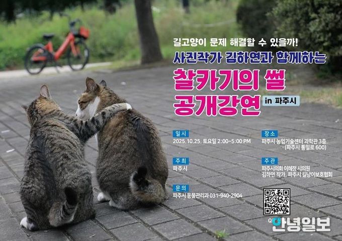 사진작가 김하연 강사를 초청해 ‘길고양이 인식개선 교육’을 진행하며, 반려인과 비반려인 누구나 참여할 수 있고, 교육은 무료로 진행된다. 참여를 원하는 시민은 정보 무늬(QR코드)를 통해 신청할 수 있다.