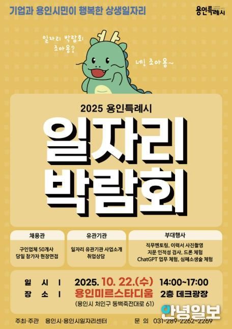 안녕일보 배윤 기자 | 용인특례시는 오는 22일 오후 2시부터 5시까지 용인미르스타디움 2층 덱(deck) 광장에서 2025년 하반기 일자리박람회를 개최한다고 17일 밝혔다.