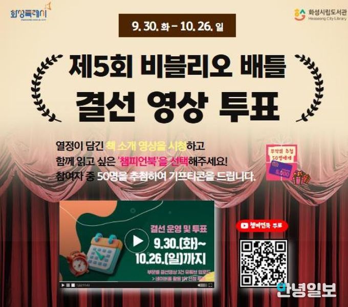 안녕일보 배윤 기자 | 화성시문화관광재단은 오는 10월 26일까지 '제5회 비블리오 배틀' 결선 영상투표를 진행한다.
