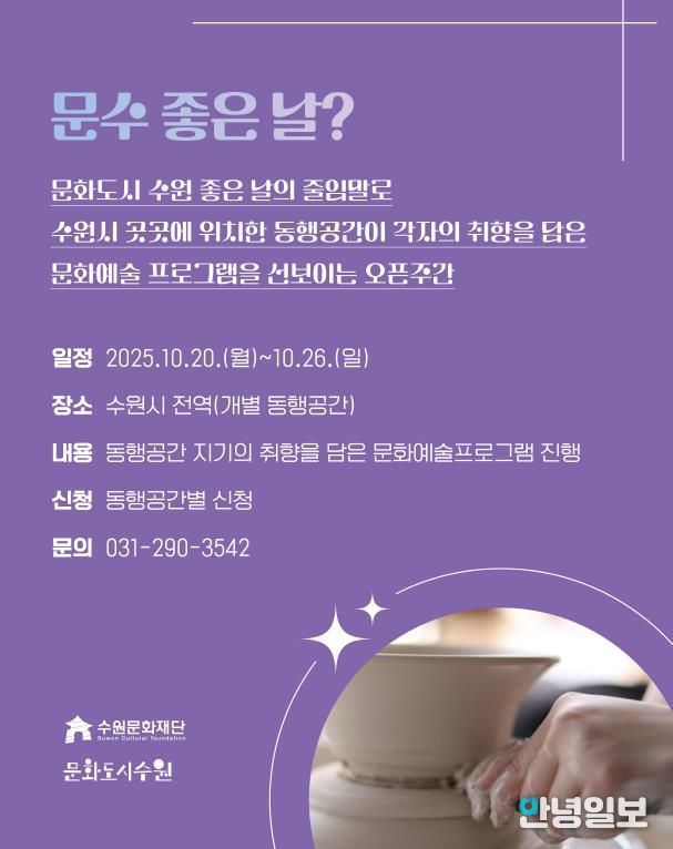 ‘문수 좋은 날’은 ‘문화도시 수원 좋은 날’의 줄임말로, 수원시 전역에 흩어진 동네 문화 거점이자 문화도시 수원과 함께하는 ‘동행공간’에서 문화예술 프로그램을 일주일간 집중적으로 시민들에게 선보이는 기간이다.