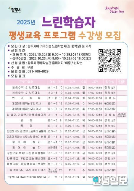 안녕일보 배윤 기자 | 광주시는 느린 학습자 초·중등학생과 그 가족을 대상으로 맞춤형 평생교육 프로그램을 운영한다고 17일 밝혔다.