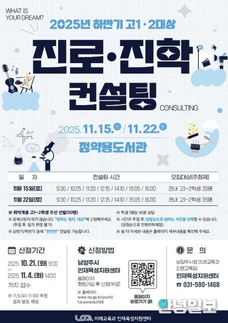 안녕일보 배윤 기자 | 남양주시는 오는 21일부터 ‘2025년 하반기 진로·진학 컨설팅’참가자를 모집한다고 밝혔다.