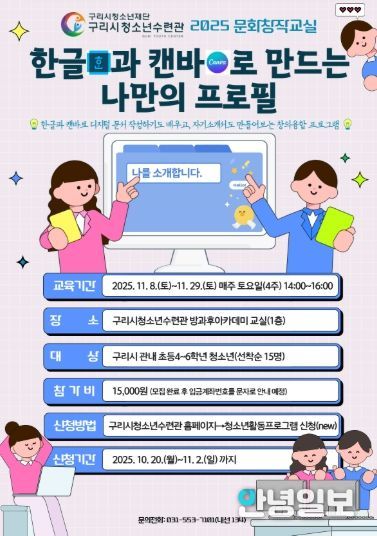 안녕일보 배윤 기자 | 구리시청소년재단 청소년수련관은 청소년들의 디지털 문해력 향상과 자기 표현력 강화를 위한 실습형 프로그램 '한글과 캔바로 만드는 나만의 프로필'의 참가자를 10월 20일부터 11월 2일까지 수련관 홈페이지에서 선착순 모집한다고 밝혔다.
