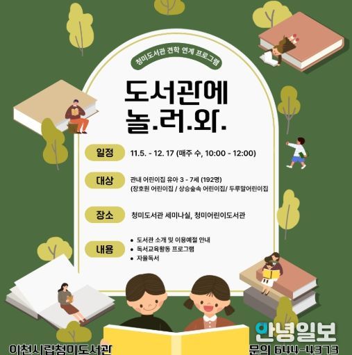 안녕일보 배윤 기자 | 이천시 청미도서관은 오는 11월 5일부터 12월 17일까지 관내 어린이집 유아를 대상으로 도서관 견학 연계 프로그램 ‘도서관에 놀.러.와. 시즌2’를 운영한다.