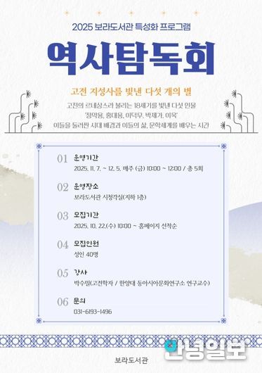 안녕일보 배윤 기자 | 용인특례시 보라도서관은 오는 11월 7일부터 12월 5일까지 고전 인문학 프로그램으로 ‘2025 역사 탐독회’를 운영한다고 21일 밝혔다.
