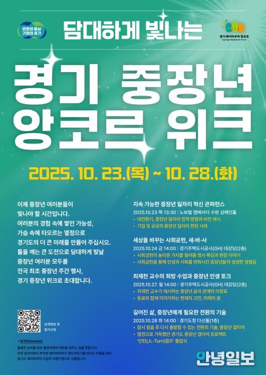 안녕일보 배윤 기자 | 경기도가 중장년 세대의 도약과 성장을 지원하기 위해 23일부터 28일까지 6일간 ‘경기 중장년 앙코르 위크(week)’을 개최한다.