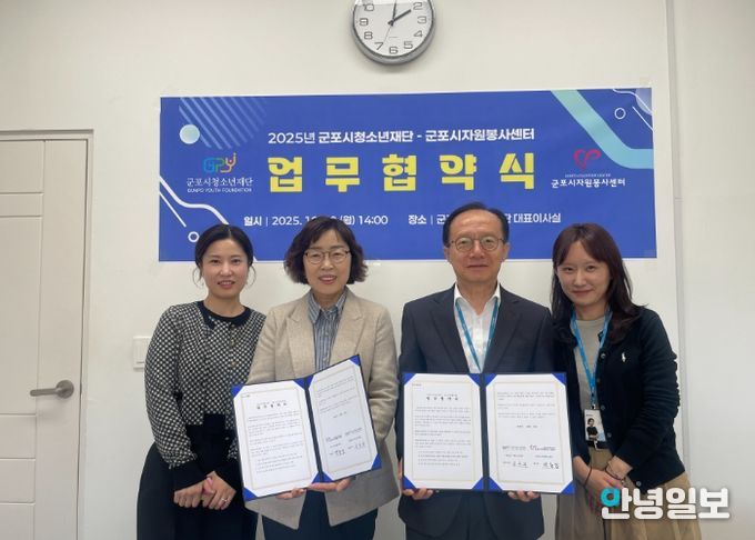 안녕일보 배윤 기자 | 군포시청소년재단은 10월 20일 군포시청소년재단 대표이사실에서 군포시자원봉사센터와 지역사회 상생 및 자원봉사 활성화를 위한 업무협약을 체결했다.