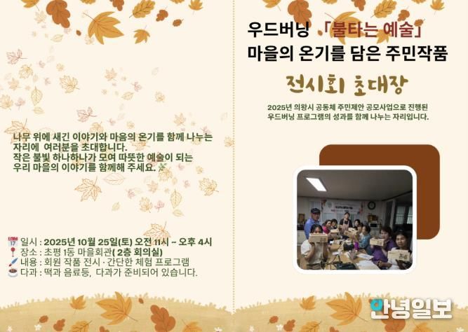 안녕일보 배윤 기자 | 의왕시는 마을공동체 자강불식이 오는 10월 25일 초평1동마을회관(윗새우대북길 14)에서'우드버닝, 불타는 예술'작품전시회를 개최한다고 밝혔다.