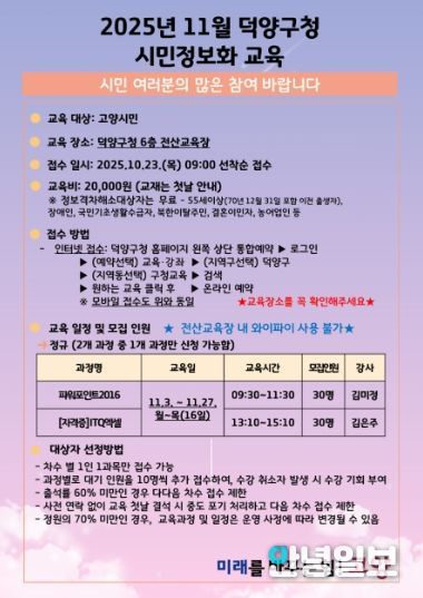 안녕일보 배윤 기자 | 고양특례시 덕양구는 고양시민을 대상으로 하는 ‘9차 시민정보화교육’ 정규과정 수강생을 오는 23일 오전 9시부터 모집한다고 밝혔다.
