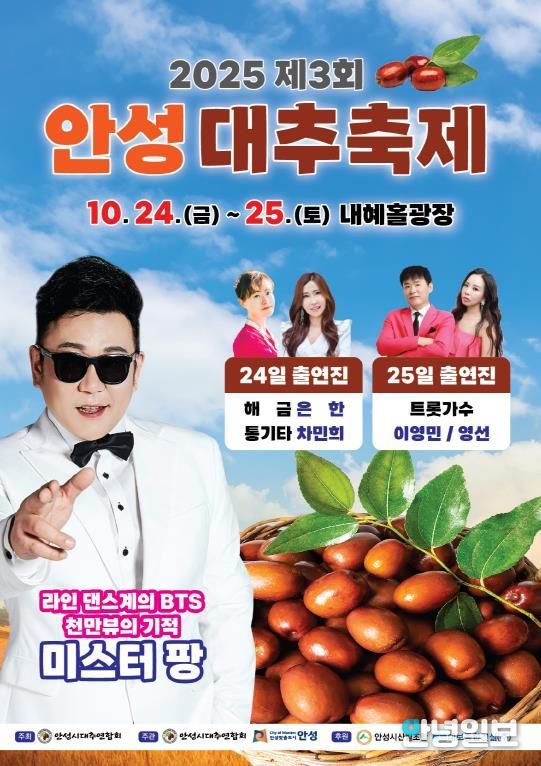 이번 행사는 안성시대추연합회와 안성시가 주관하여 진행하는 직거래장터 행사로 약 25개의 판매부스를 운영하고 대추가요제 등 각종 공연이 마련될 예정이다.