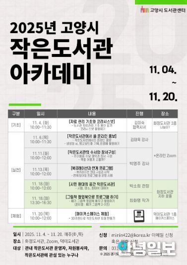안녕일보 배윤 기자 | 고양특례시는 관내 공·사립 작은도서관 운영자와 자원봉사자의 역량 강화를 위해 오는 11월 4일부터 20일까지 총 7회에 걸쳐‘2025년 작은도서관 아카데미’를 운영한다고 밝혔다.