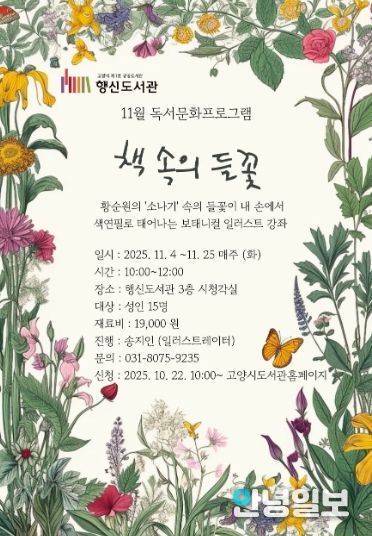 안녕일보 배윤 기자 | 고양특례시 행신도서관은 성인을 대상으로 ‘책 속의 들꽃’을 운영한다고 밝혔다.