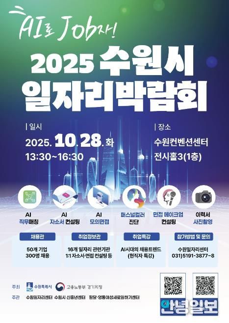 안녕일보 배윤 기자 | 수원특례시와 고용노동부 경기지청은 10월 28일 오후 1시 30분부터 4시 30분까지 수원컨벤션센터 전시홀에서 ‘AI로 JOB자-2025 수원시 일자리박람회’를 개최한다.