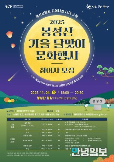 안녕일보 배윤 기자 | 김포문화재단(대표이사 이계현)은 오는 11월 4일 김포 봉성산 일원에서 '2025 봉성산 가을 달맞이 문화행사'를 개최한다고 밝혔다.
