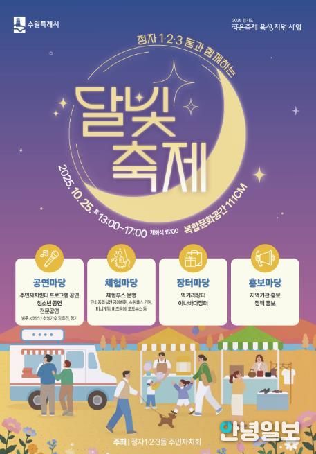 안녕일보 배윤 기자 | 수원시 장안구 정자2동 주민자치회는 오는 25일, 오후 1시부터 복합문화공간 111CM에서 ‘정자1·2·3동과 함께하는 달빛축제’를 개최한다.
