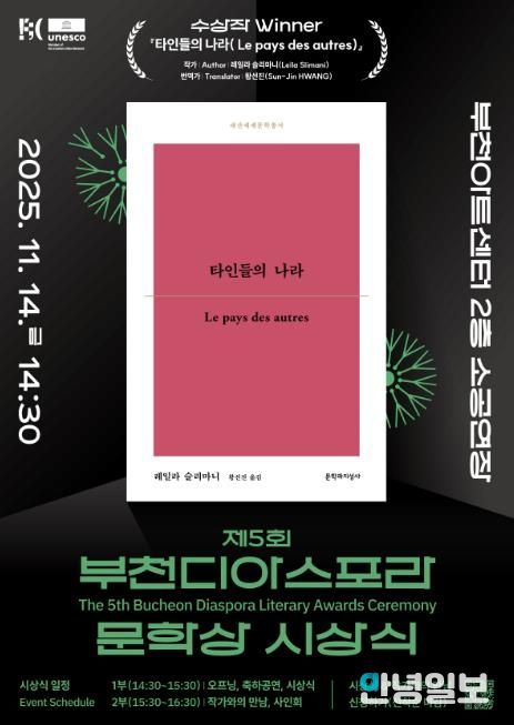 안녕일보 배윤 기자 | 부천시는 11월 14일 부천아트센터에서 열리는 ‘2025년 제5회 부천디아스포라문학상’ 시상식을 앞두고, 수상작으로 레일라 슬리마니 작가의 ‘타인들의 나라(Le pays des autres)’를 선정했다고 22일 밝혔다.