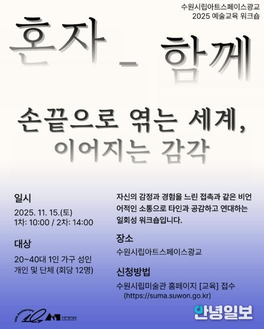 안녕일보 배윤 기자 | 경기도 수원시립미술관은 예술을 통해 타인과의 관계를 확장하고 감각을 회복하는 예술교육 워크숍 '혼자-함께'를 11월 15일 수원시립아트스페이스광교에서 개최한다.