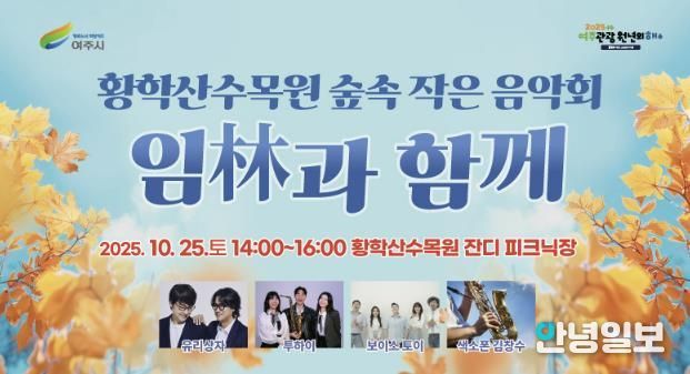 안녕일보 배윤 기자 | 여주시는 오는 10월 25일 오후 2시부터 4시까지 황학산수목원 잔디피크닉장에서 ‘임(林)과 함께’ 음악회를 연다고 밝혔다.