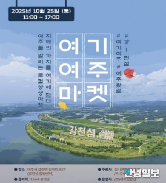안녕일보 배윤 기자 | 여주세종문화관광재단은 경기콘텐츠진흥원과 함께 10월 25일 강천섬에서 체험형 플리마켓 '2025 여기 여주 마켓'을 개최한다고 밝혔다. 이번 행사는 강천섬을 무대로 지역 로컬기업과 시민이 함께 즐길 수 있는 참여형 플리마켓으로 마련됐으며, 자연 속에서 다양한 체험과 소비가 어우러지는 로컬 축제로 운영된다.