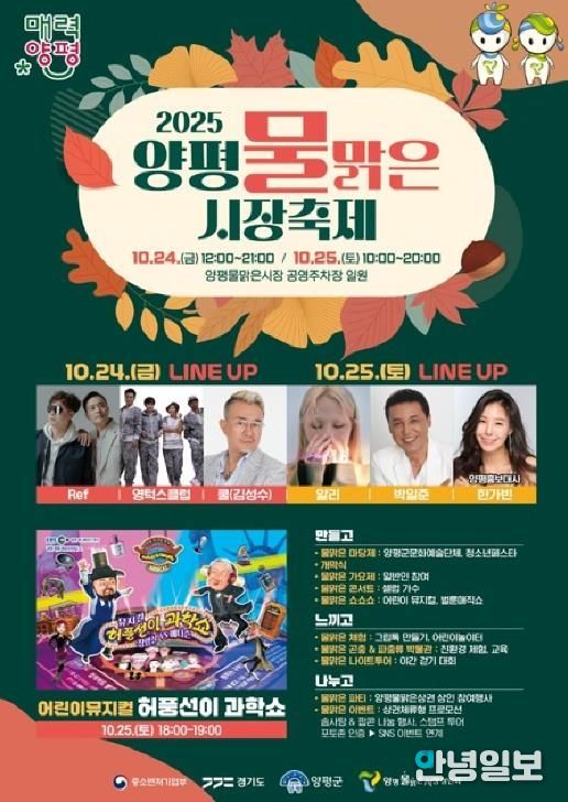 안녕일보 배윤 기자 | 양평물맑은시장의 대표 축제인 ‘2025 양평물맑은시장 축제’가 오는 10월 24일부터 25일까지 양평물맑은시장 공영주차장에서 열린다.
