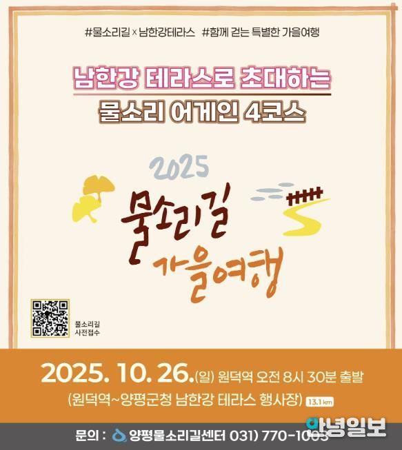 전진선 양평군수는 “물소리길 가을여행은 매년 많은 도보 여행객들이 찾는 대표 걷기 축제로, 올해는 남한강테라스 행사와 함께 더욱 풍성한 프로그램으로 준비했다”며, “양평의 아름다운 가을을 함께 걸으며 즐기시길 바란다”고 전했다.