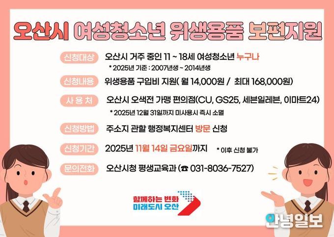 안녕일보 배윤 기자 | 오산시는 여성청소년의 건강권 보장과 보편적 복지 실현을 위해 올해 처음 시행한 ‘여성청소년 위생용품 보편지원사업’의 신청을 오는 11월 14일 마감한다. 아직 신청하지 않은 대상자는 혜택을 받을 수 있도록 서둘러 참여해야 한다.