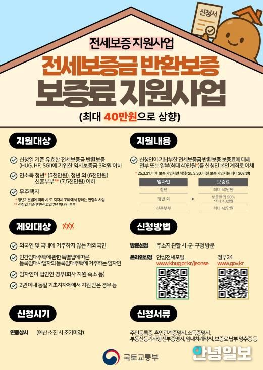 해당 사업은 주택도시보증공사(HUG)와 SGI서울보증 등의 전세보증금 반환보증 상품에 가입할 때 임차인이 납부한 보증료의 최대 40만 원을 지원하는 제도다.