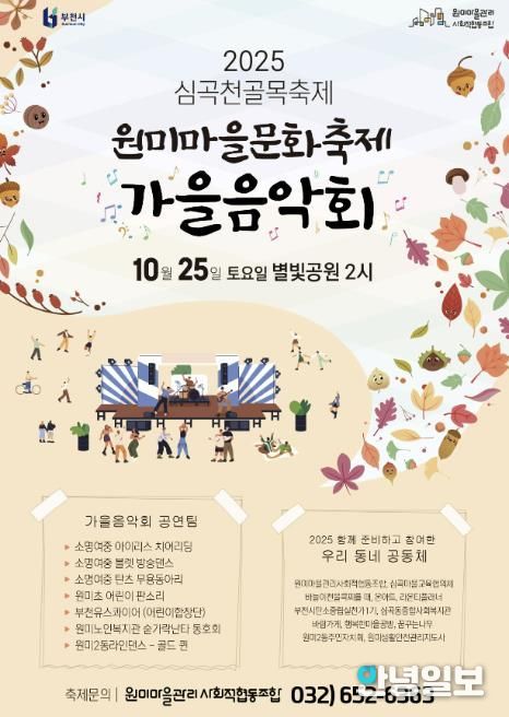 안녕일보 배윤 기자 | 부천시는 10월 25일 원미별마루와 별빛공원 일대(부천로 90번길 51)에서 ‘2025년 심곡천 골목축제–원미마을문화축제 가을 음악회’를 연다. 이번 행사는 부천시 원도심재생과가 주최하고, 원미마을관리사회적협동조합이 주관한다.