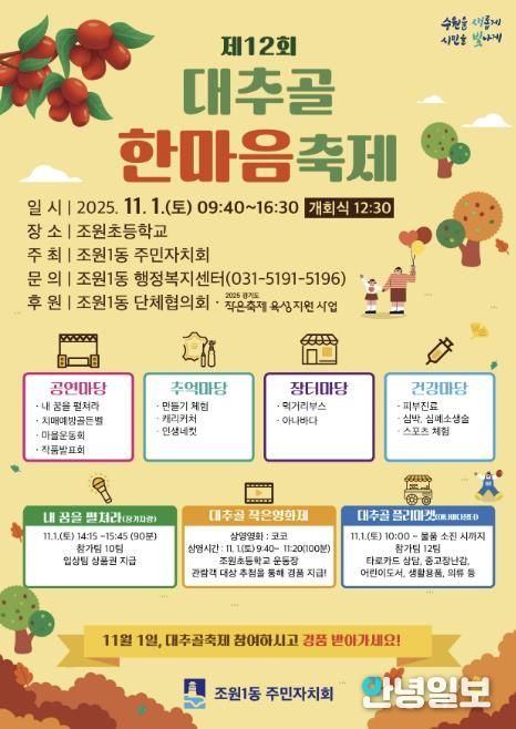 안녕일보 배윤 기자 | 수원시 장안구 조원1동 주민자치회와 조원1동 단체협의회는 오는 11월 1일, 지역 주민이 함께 어울리는 ‘제12회 대추골 한마음 축제’를 개최한다.