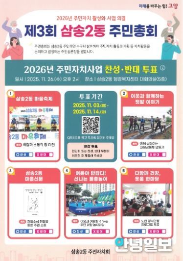 안녕일보 배윤 기자 | 고양특례시 덕양구 삼송2동 주민자치회는 오는 11월 26일 개최될 ‘제3회 주민총회’를 앞두고, 2026년도 주민자치사업 선정을 위한 사전투표를 진행한다고 밝혔다.