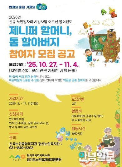 안녕일보 배윤 기자 | 의정부시는 2026년도 노인일자리 시범사업으로 추진되는 어르신 영어 멘토 프로그램 ‘제니퍼 할머니, 톰 할아버지’ 사업 참여자를 모집한다.
