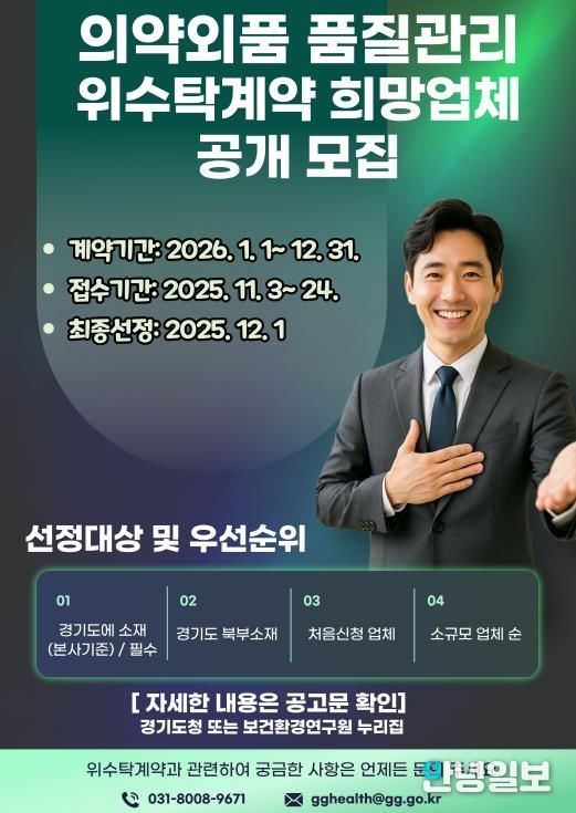 안녕일보 배윤 기자 | 경기도보건환경연구원은 오는 24일까지 ‘2026년 의약외품 품질검사 위·수탁계약’ 참여를 희망하는 제조·수입업체를 모집한다.