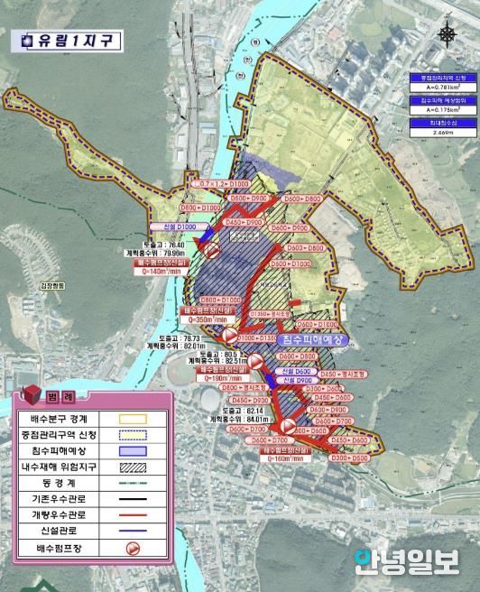 하수도정비 중점관리지역으로 지정된 ‘유림1지구 및 중앙지구’의 면적은 약 1.08㎢다. 이 지역은 하수관로의 통수 능력이 부족하고, 하천 수위가 상승할 경우 내수 배제가 어려운 지역으로 꼽혔다.