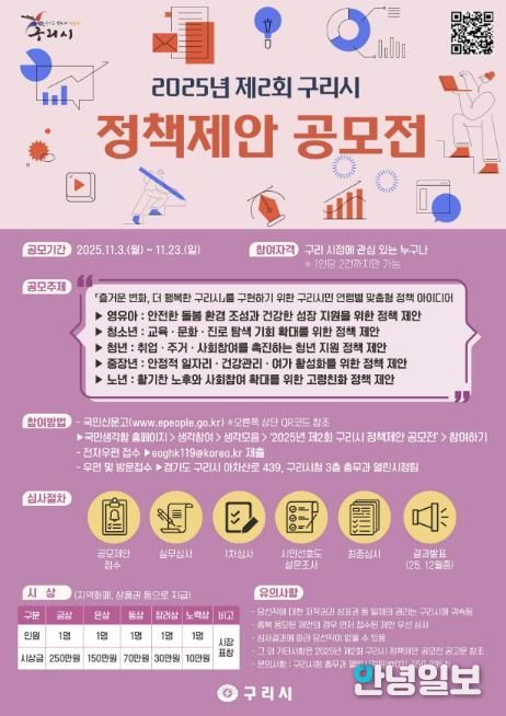 안녕일보 배윤 기자 | 구리시는 오는 11월 3일부터 11월 23일까지'2025년 제2회 구리시 정책 제안 공모전'을 개최한다고 밝혔다. 이번 공모전의 주제는 ‘구리 시민(영유아·청소년·청년·중장년·노년) 나이별 맞춤형 정책 아이디어’다.