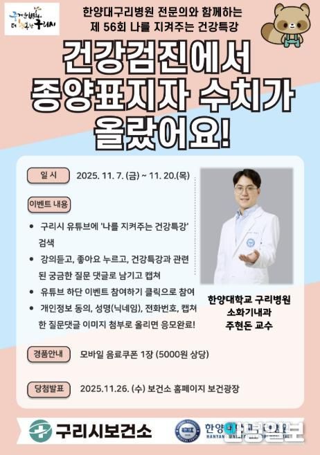 안녕일보 배윤 기자 | 구리시는 시민의 암 예방과 건강관리 역량 강화를 위해, 오는 7일 한양대학교구리병원 소화기내과 주현돈 교수를 초청해 ‘건강검진에서 종양표지자 수치가 올랐어요!’를 주제로 한 건강특강을 구리시 공식 유튜브 채널 ‘구리비전’을 통해 송출한다.