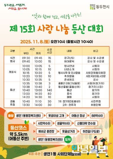 안녕일보 배윤 기자 | 동두천시 생연1동 사회단체협의회는 오는 8일 시민이 함께하는 ‘제15회 사랑나눔 등산대회’를 개최한다고 밝혔다.