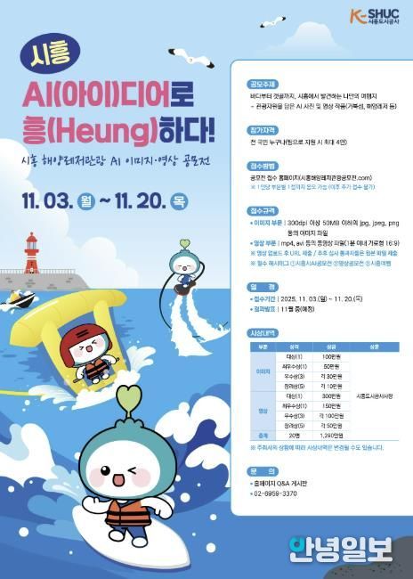 이번 공모전은 ‘바다부터 갯골까지, 시흥에서 발견한 나만의 여행’을 주제로 진행된다. 거북섬, 해양레저 등 시흥의 관광자원을 담은 AI 이미지 및 영상 작품을 공모하며, 시흥시에 관심 있는 국민 누구나 개인 또는 4인 이내의 팀으로 참여할 수 있다.
