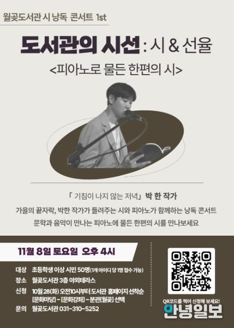 안녕일보 배윤 기자 | 시흥시 월곶도서관은 오는 11월 8일 오후 4시, 월곶도서관 야외 테라스에서 어린이를 비롯한 모든 세대가 함께 감상할 수 있는 ‘도서관의 시선:시·선율’ 행사를 진행한다.