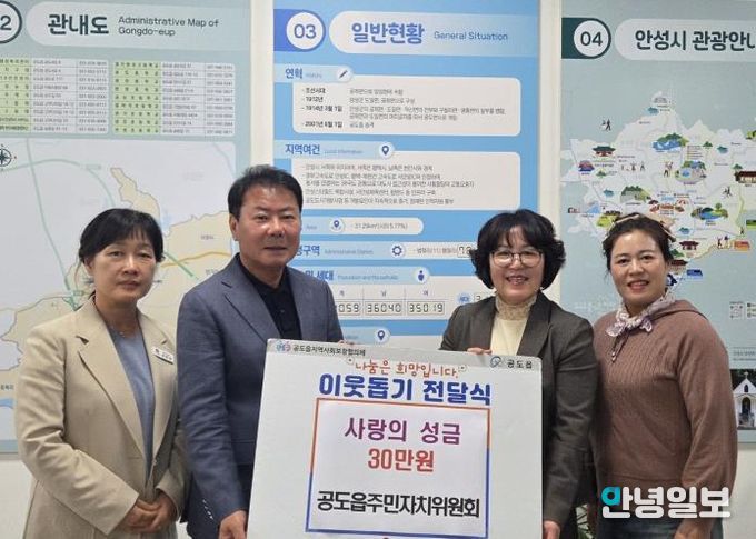 안녕일보 배윤 기자 | 안성시 공도읍주민자치위원회는 지역 내 어려운 이웃을 돕기 위해 30만원의 성금을 기탁했다.