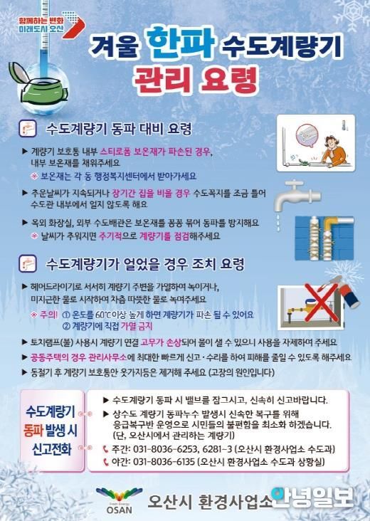안녕일보 배윤 기자 | 오산시는 겨울철 기온 강하로 인한 수도계량기 동파·동결 사고 예방을 위해 이달부터 내년 3월까지 ‘겨울철 수도계량기 동파 예방 대책’을 본격 추진한다고 밝혔다.