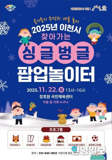 안녕일보 배윤 기자 | 이천시는 아동친화도시 놀이문화 확산과 아동의 놀권리 보장을 위해 『찾아가는 싱글벙글 팝업 놀이터‘겨울놀이’』행사를 오는 11월 22일 장호원 국민체육센터에서 개최한다고 밝혔다.