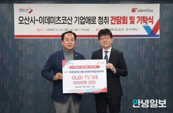 또 이데미츠코산은 지역사회 공헌 활동의 일환으로 OLED 기술이 적용된 약 500만 원 상당의 TV를 오산시에 기탁했으며, 시는 전달받은 기기를 관내 경로당 등에서 활용할 계획이라고 밝혔다.