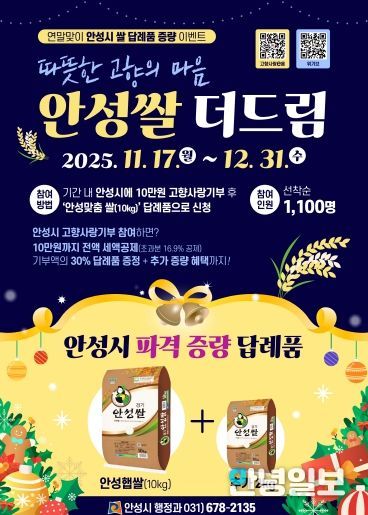 이번 이벤트는 안성시가 고향사랑기부제를 통해 받은 큰 성과를 시민들과 기부자들에게 감사의 마음으로 돌려주기 위해 기획됐으며, 안성쌀의 인기를 더욱 높이고 소비를 촉진할 수 있는 기회로 자리 잡을 것으로 기대하고 있다.