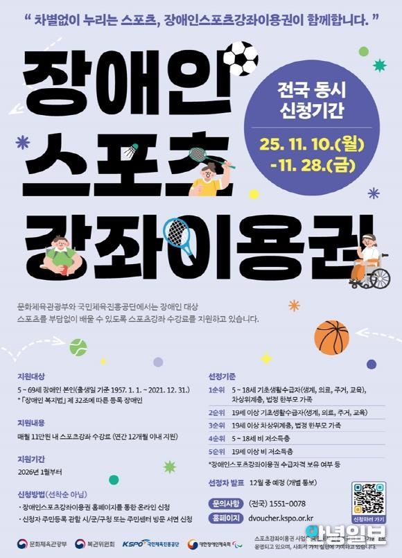 장애인스포츠강좌이용권 지원사업은 관내 5~69세까지의 장애인을 대상으로 1인당 월 11만 원 범위 내 강좌 수강료를 지원하는 사업이다. 대상자로 선정되면 2026년 한 해 동안 스포츠강좌 이용권 전용카드로 매월 수강료를 지원받게 된다.