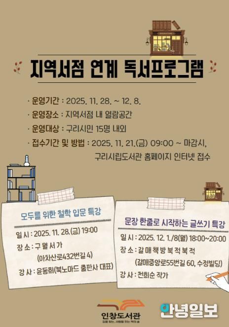 백경현 구리시장은“지역 서점과의 협력을 통해 시민이 더욱 가까운 공간에서 책과 사람, 생각이 어우러지는 인문 독서 프로그램을 접할 수 있도록 지속적으로 확대해 나가겠다”라며, “지역 서점과 시립도서관이 함께 성장하는 상생의 독서 문화 환경을 조성해 나가겠다.”라고 전했다.