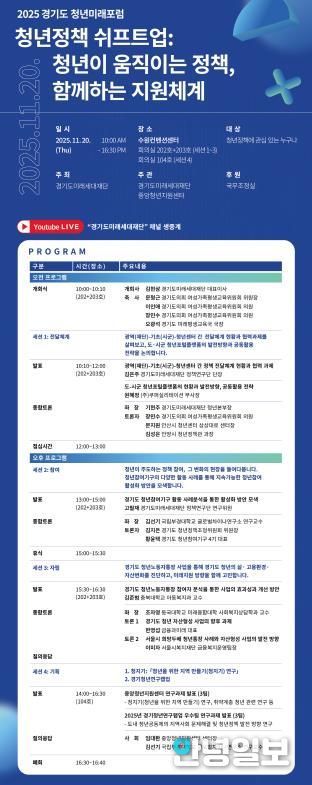 이날 포럼은 오전 10시부터 오후 4시 30분까지 진행되며, 청년정책에 관심 있는 누구나 참여할 수 있다. 수원컨벤션센터 202호, 203호, 104호 회의실에서 세션별로 열리며, 현장 참여 외에도 경기도미래세대재단 유튜브 채널을 통해 생중계로 시청할 수 있다.
