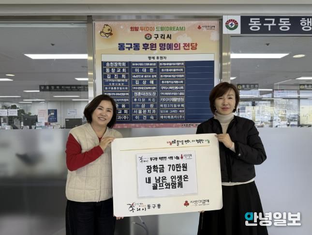 안녕일보 배윤 기자 | 구리시 동구동 행정복지센터는 지난 18일 동구동 행정복지센터 대회의실에서 '내 남은 인생은 골프와 함께' 모임으로부터 관내 취약계층 청소년을 위한 장학금 70만 원을 기탁받았다고 밝혔다.