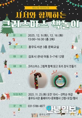 안녕일보 배윤 기자 | 김포시 풍무도서관은 ‘사서와 함께하는 크리스마스 책놀이’프로그램을 12월 9일과 16일 오후 3시부터 4시 30분까지 운영한다.
