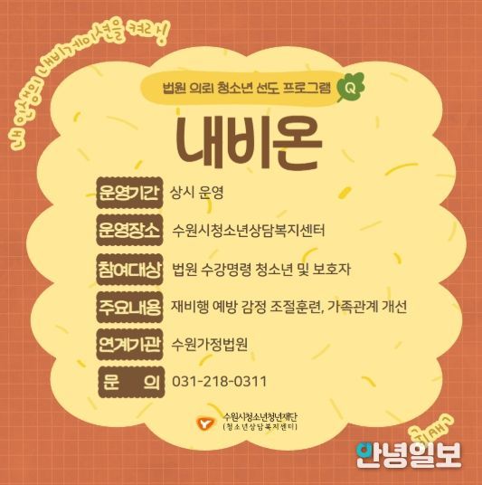 수원시청소년상담복지센터 관계자는 “내비온 프로그램은 단순히 법적 의무 교육이 아니라, 청소년과 보호자가 함께 성장하는 회복적 과정이다. 앞으로도 청소년들이 스스로의 삶을 주도하고 건강한 사회구성원으로 성장할 수 있도록 지속적으로 지원하겠다.”라고 밝혔다.