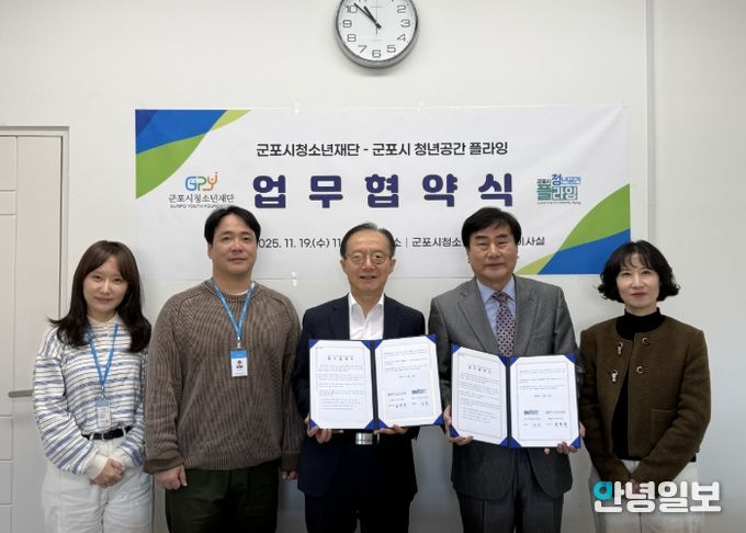 안녕일보 배윤 기자 | 재단법인 군포시청소년재단은 11월 19일 대표이사실에서 군포시청년공간플라잉과 청소년·청년의 성장 연계 및 참여 지원을 위한 업무협약을 체결했다.